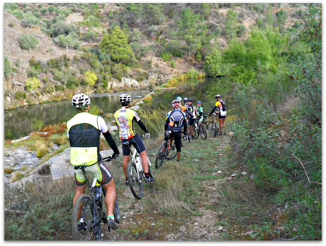 Bebemos café na Represa, daqui seguimos pelos Amarelos e Carapetosa, antes dos Rodeios virámos à direita para a praia dos Gaviões. Desta vez a passagem pelo açude foi algo arriscada ! pois as pedras encontravam-se bastante escorregadias, mas com cuidado, todos passámos sem problema. Já na margem direita do Ocreza, entrámos na tal GR 10 ! o que para mim se veio a revelar uma grande deceção pois o trilho encontra-se bastante fechado por mato, estevas, e outros arbustos, os quais nos impediam de pedalar, obrigando-nos a fazer PTT várias vezes, sendo a passagem da ribeira das Ferrarias a mais complicada.